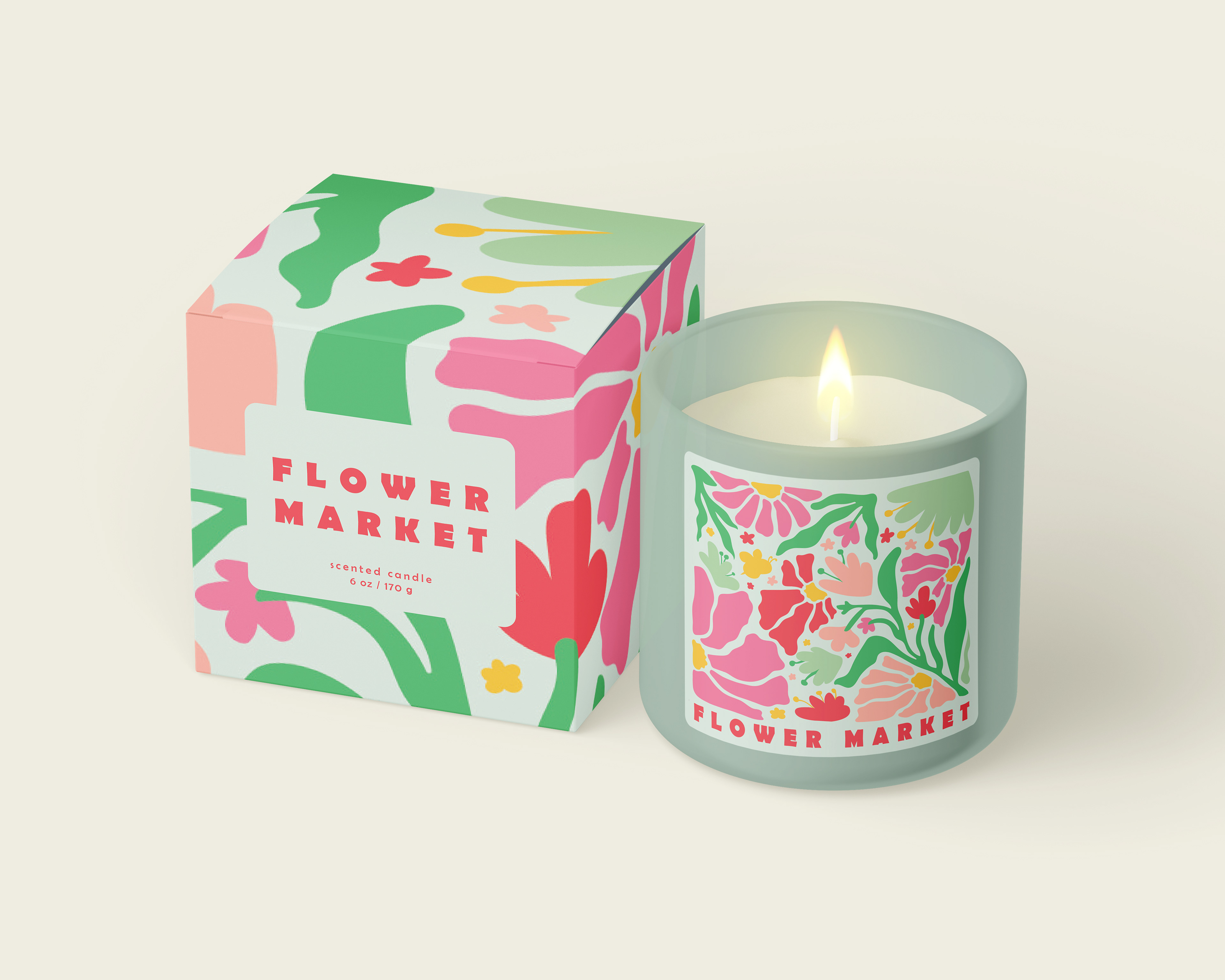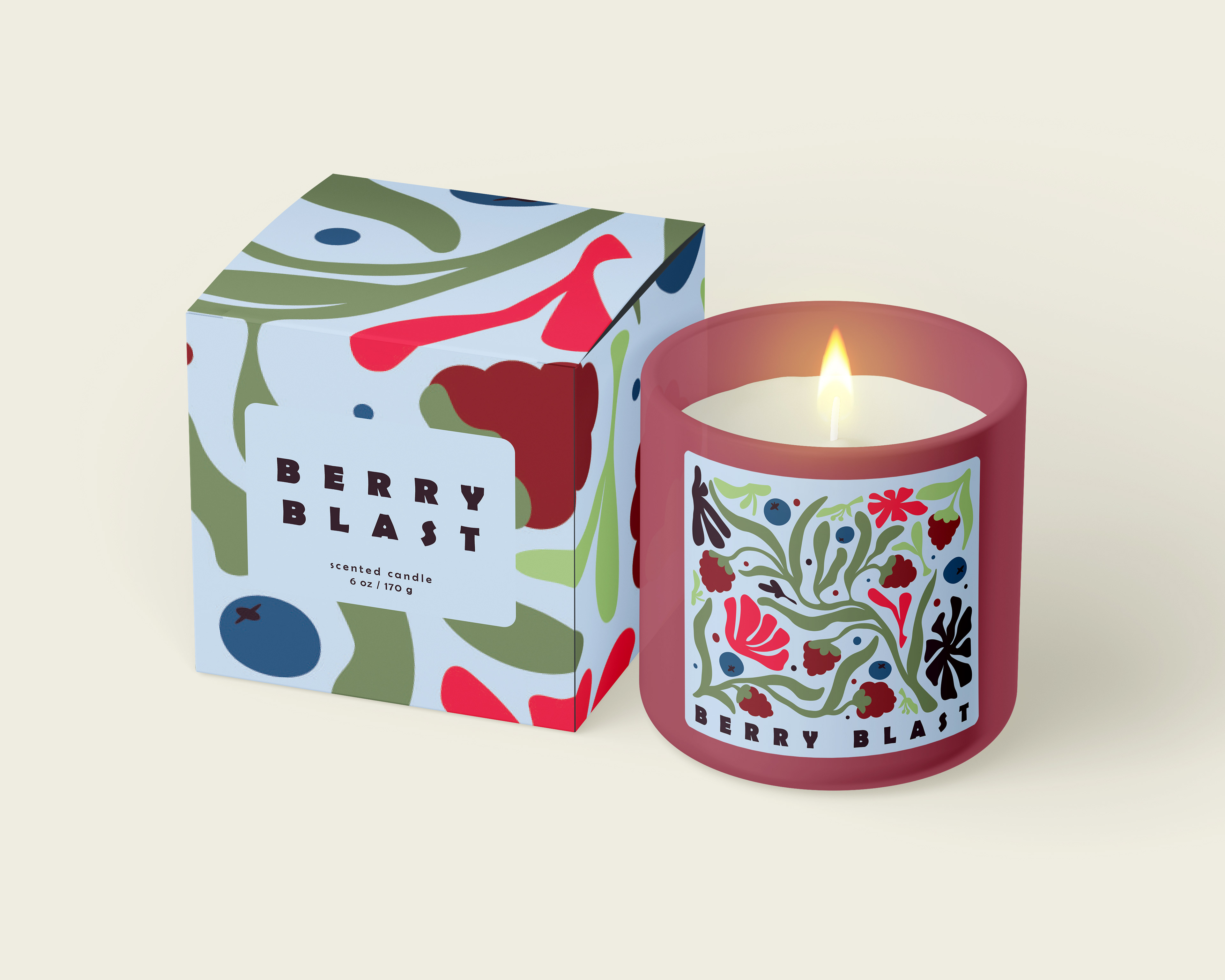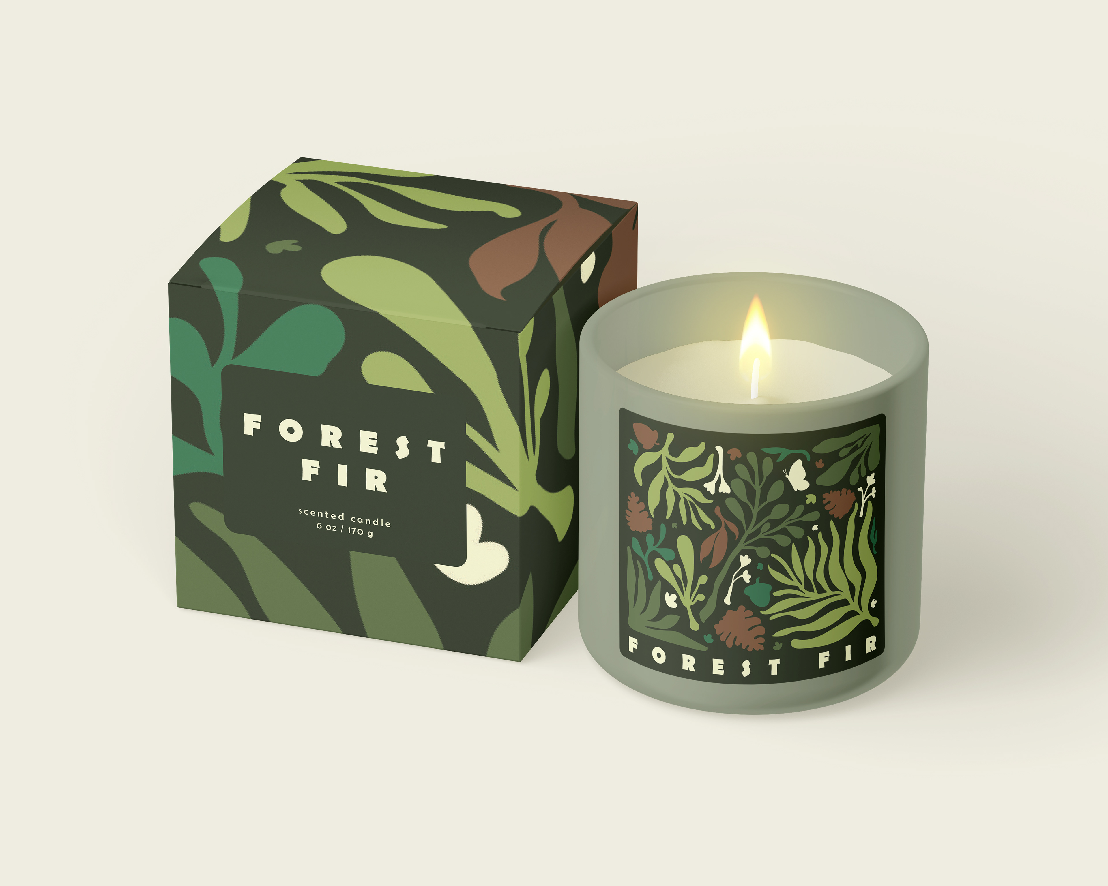 A mock candle collection with thoughtfully designed labels and packaging inspired by the organic shapes and colours found within the notes of each scent.