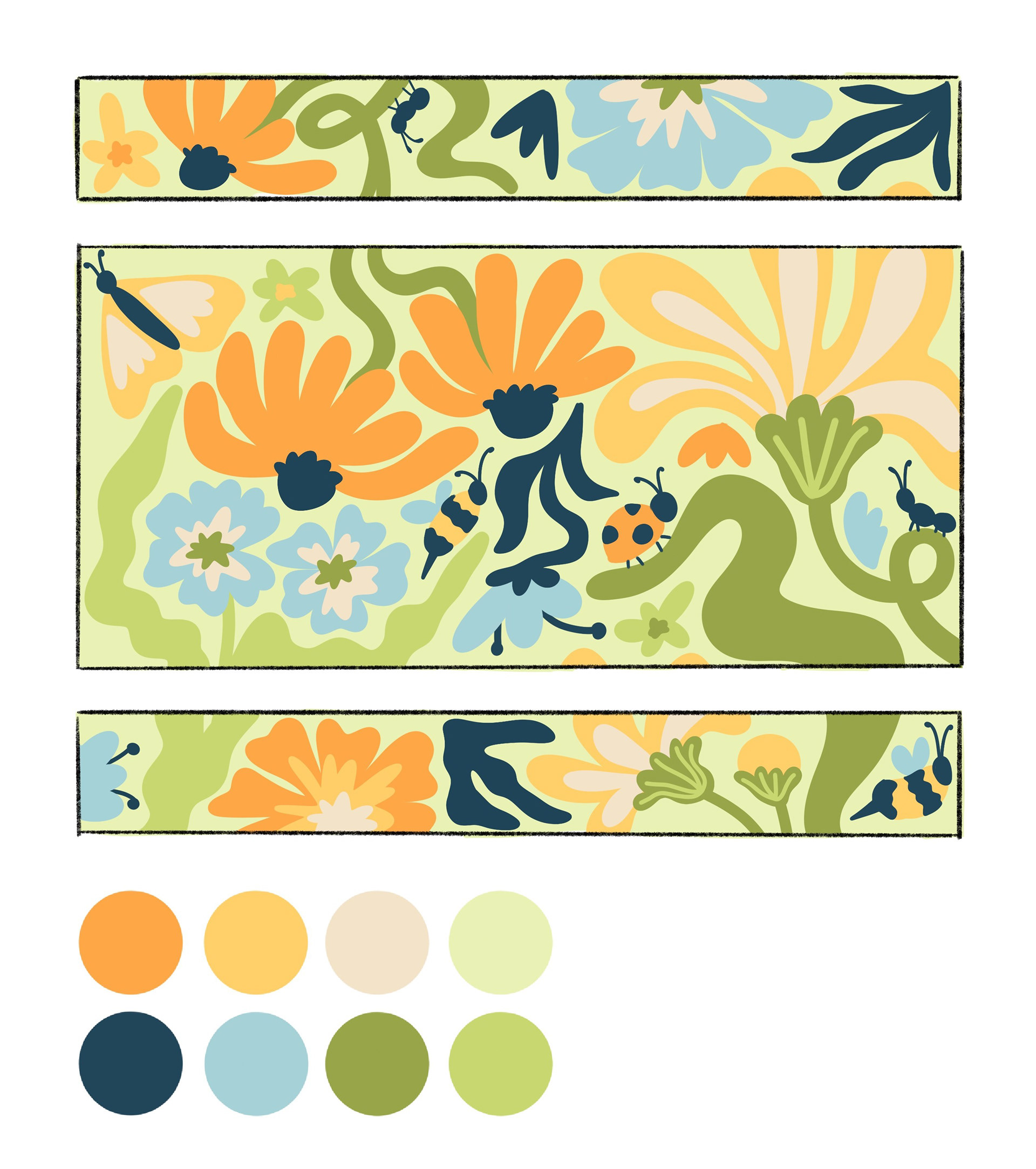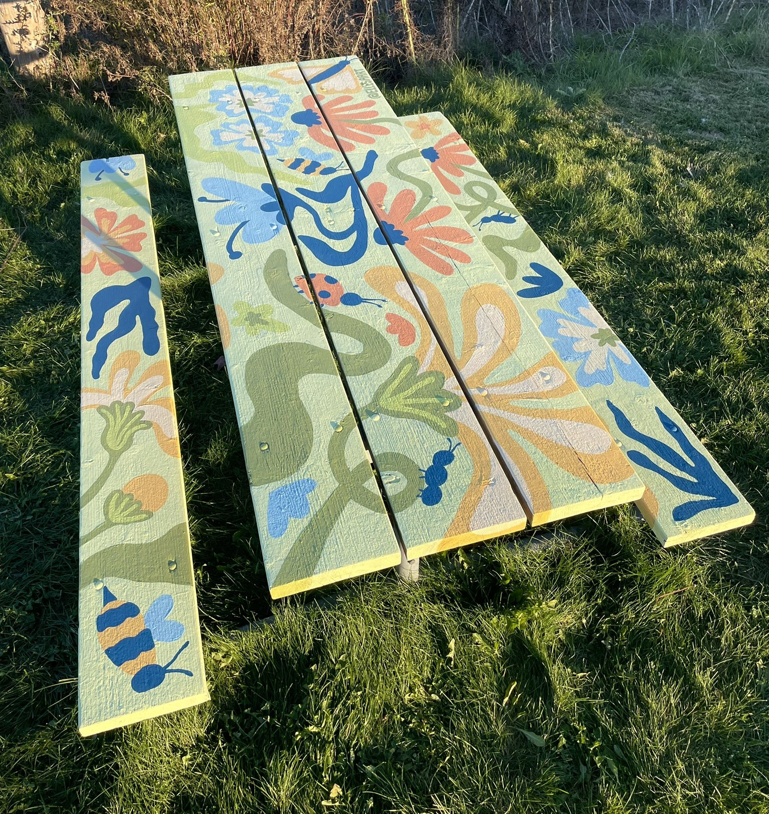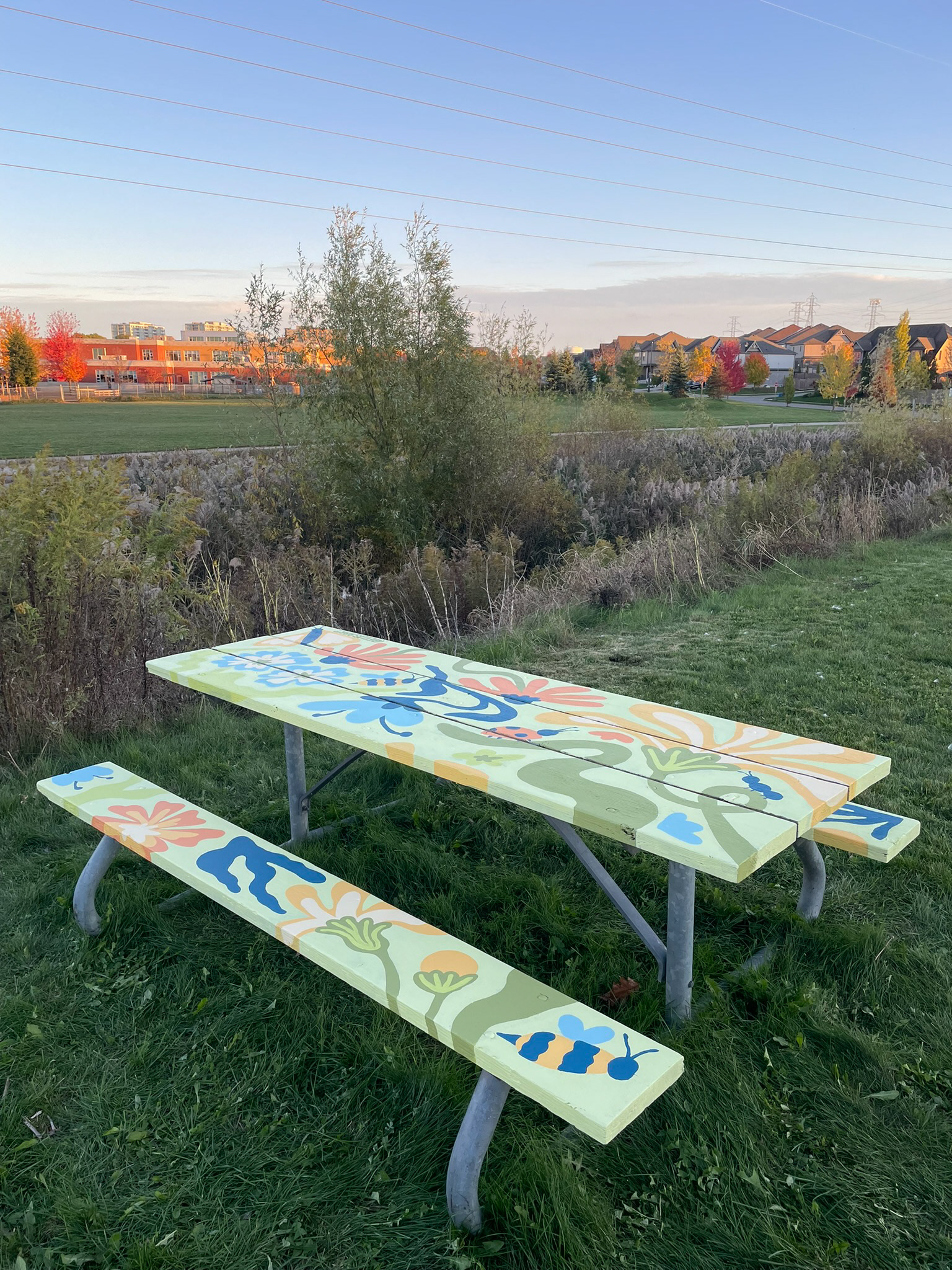 This picnic bench design was commissioned by the city of Waterloo to transform the surface of the bench into a bright and buzzing garden. A variety of native flowers and insects can be seen representing the diversity that can be found in the neighbourhoods of Waterloo. The winding and organic shapes create a fun and playful illustration sparking feelings of joy and whimsy to all who will use or view the picnic bench.
