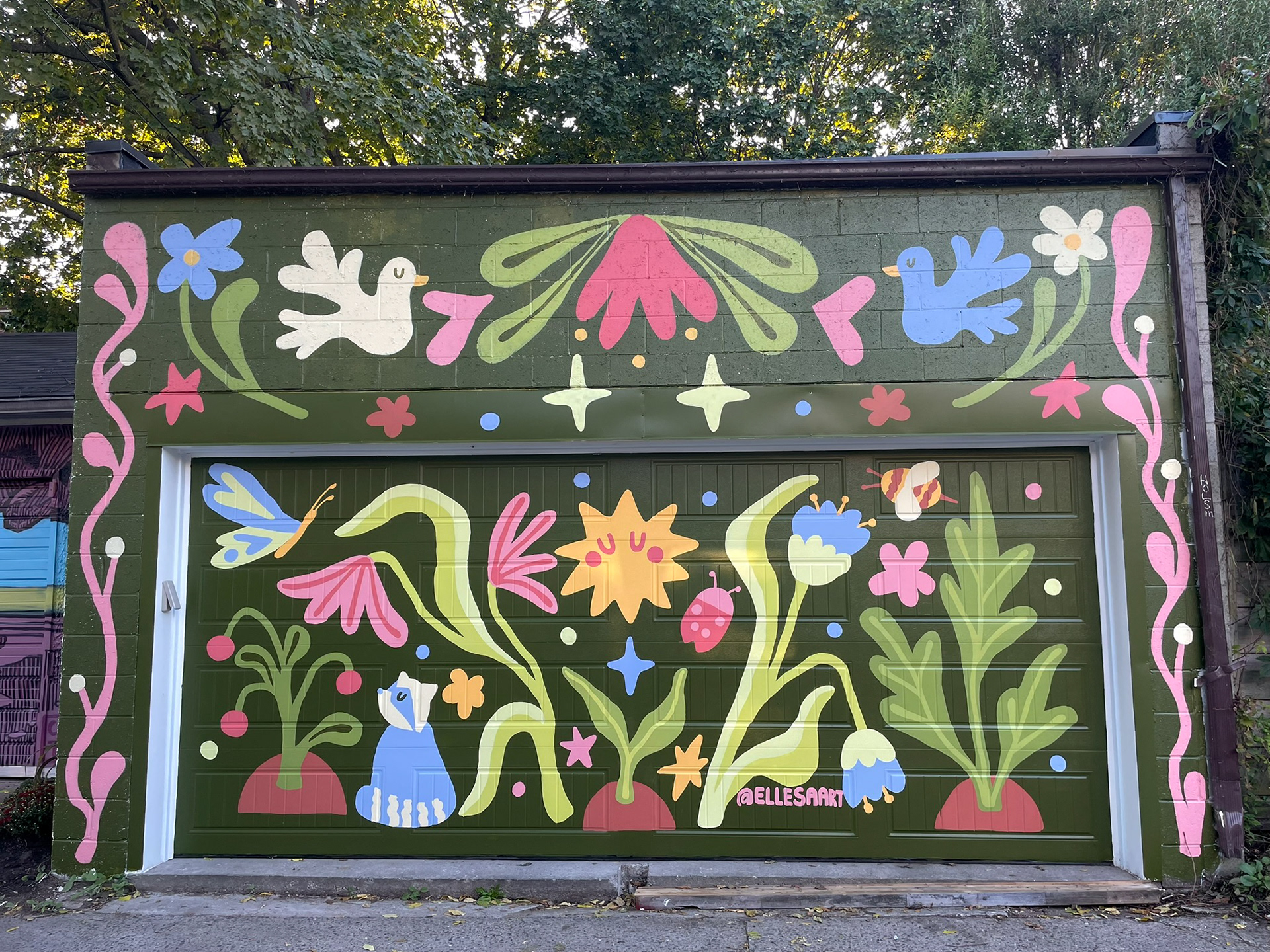 This mural was part of a Laneway Mural Jam at Deborah Brown Lane. hosted by StreetARTororonto (StART), Karma Co-op, and Nella Cucina. Each artist designed a mural incorporating themes of food and nature while keeping in mind the history of the area and notes from the homeowners to be considered as prompts.